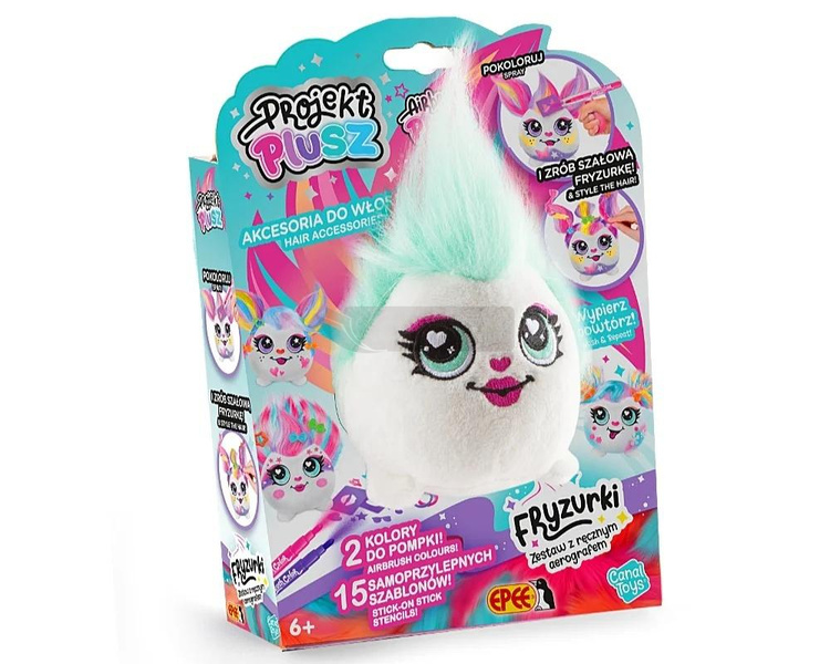 Udekoruj swojego pluszaka za pomocą pompki aerografu. To proste! Przyklej szablon i użyj sprayu, aby stworzyć fantastyczne wzory. Możesz nawet pokolorować mu włosy i stworzyć z nich szałową fryzurkę! A po zabawie, po prostu go wypierz i zacznij od nowa.