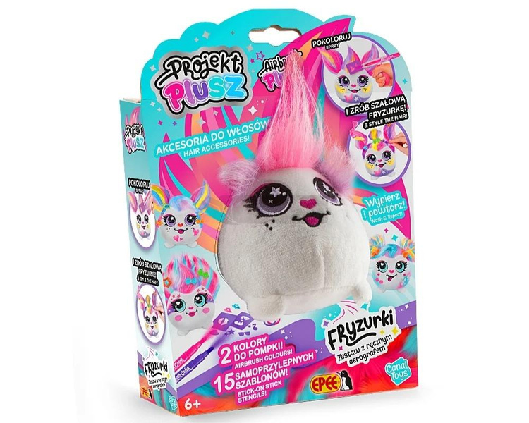 Udekoruj swojego pluszaka za pomocą pompki aerografu. To proste! Przyklej szablon i użyj sprayu, aby stworzyć fantastyczne wzory. Możesz nawet pokolorować mu włosy i stworzyć z nich szałową fryzurkę! A po zabawie, po prostu go wypierz i zacznij od nowa.