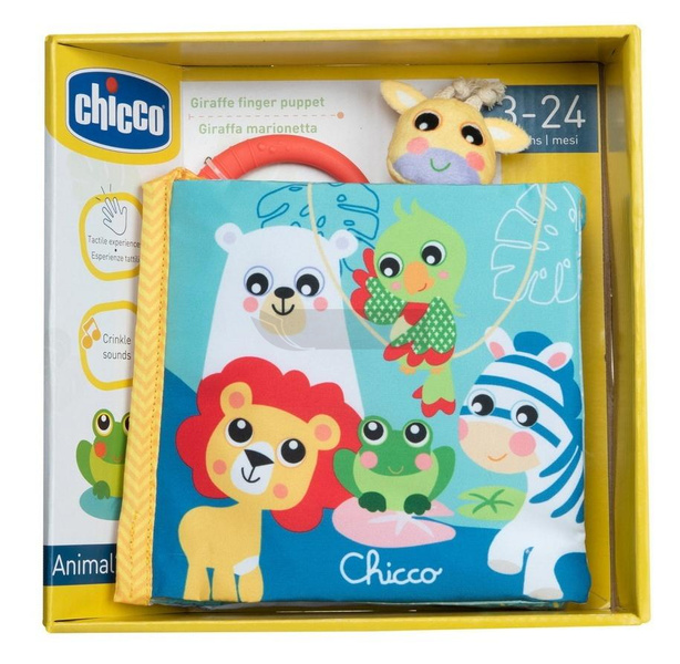 Dodatkowo wystająca znad książeczki żyrafa pełni funkcję pacynki.