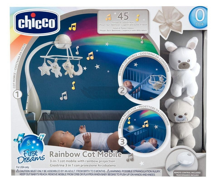 Zestaw zawiera: Karuzelę z 4 miękkimi zawieszkami (miś, króliczek, gwiazdka, księżyc), projektor tęczy, pilot zdalnego sterowania