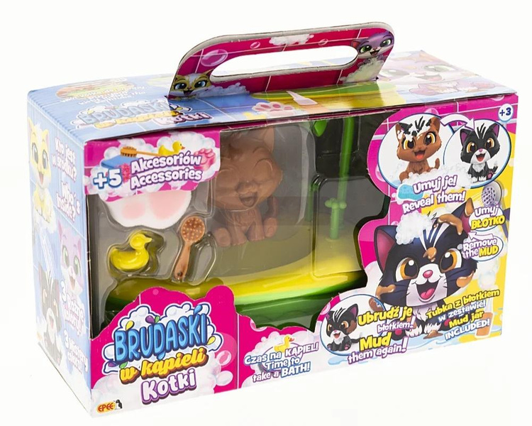 Poznaj kolekcję przesłodkich kotków, które można brudzić błotkiem, myć i zaczynać całą zabawę od nowa! Brudaski w kąpieli kotki to urocze figurki, które zostały stworzone po to, by zapewnić dzieciom mnóstwo radości i niezliczone możliwości kreatywnej zabawy. Dzięki specjalnej powłoce łatwo je wyczyścić, a zabawę ulepszą dołączone do kotków akcesoria.