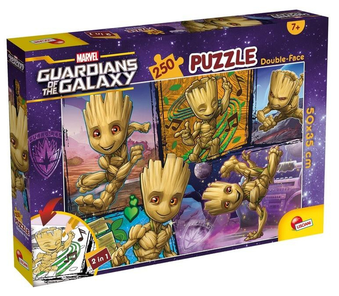 Baw się świetnie odtwarzając scenkę z Grootem znanym z filmów o Strażnikach Galaktyki! Układaj dwustronne puzzle, tworząc piękny obrazek lub koloruj jego czarno-biały odpowiednik, starając się odtworzyć kolory z kreskówki lub nadając całej scence nowego charakteru. Produkt zawiera 250 elementów.