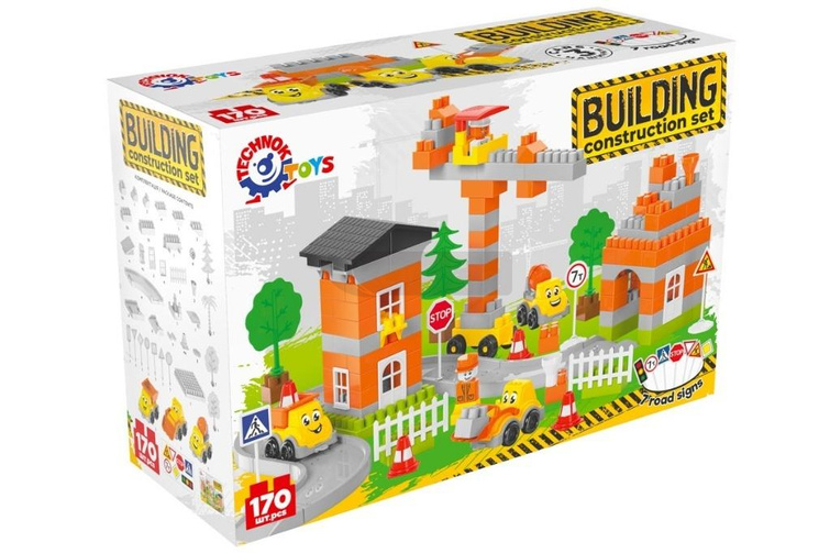 Duży zestaw składa się ze 170 elementów: klocków, torów, znaków drogowych, drzew, ogrodzeń, naklejek, różnych części do tworzenia dużych budynków oraz specjalnego sprzętu budowlanego.