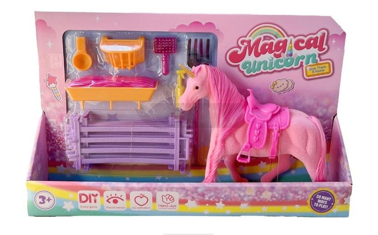 Magiczny jednorożec z różnymi akcesoriami. Dostarczany w różnych wariantach. Odpowiedni dla dzieci w wieku 3 lat i starszych.