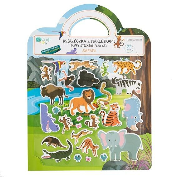 Książeczka z naklejkami to produkt skierowany do dzieci, który pozwala rozwijać kreatywność poprzez budowanie własnych opowieści przy pomocy naklejek. W zestawie znajduje się książeczka z pięknym krajobrazem i gładkim wykończeniem a także 27 naklejek typu puffy z wizerunkami afrykańskich zwierzątek : lwa, żyrafy, słonia, nosorożca czy tygrysa, które można wielokrotnie przyklejać i odklejać. Naklejki mają wypukłą teksturę, co sprawia, że są atrakcyjne w dotyku. Produkt rozwija wyobraźnię dziecka, pozwala na tworzenie różnych scenek oraz ćwiczenie zdolności manualnych i koncentracji.