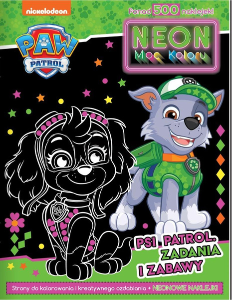 Psi Patrol. Neon Moc Koloru to książka z obrazkami oraz ponad 500 neonowymi naklejkami. W środku dziecko znajdzie strony z obrazkami do kolorowania oraz kreatywnego ozdabiania, dzięki czemu może tworzyć wyjątkowe prace. Każda strona to nowa przygoda z dzielnymi pieskami z Psiego Patrolu, a kolorowanie ulubionych bohaterów i wyklejanie stron neonowymi naklejkami to świetna zabawa. Efekt końcowy zaskoczy każdego malucha!
