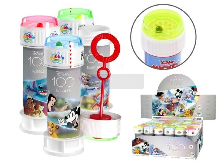 Opis: bańki mydlane z licencją D100, na każdej nakrętce znajduje się gra - labirynt z piłeczką, ilość płynu w opakowaniu: 60 ml, wym. bańki: 11,5 x 35 cm., 3+