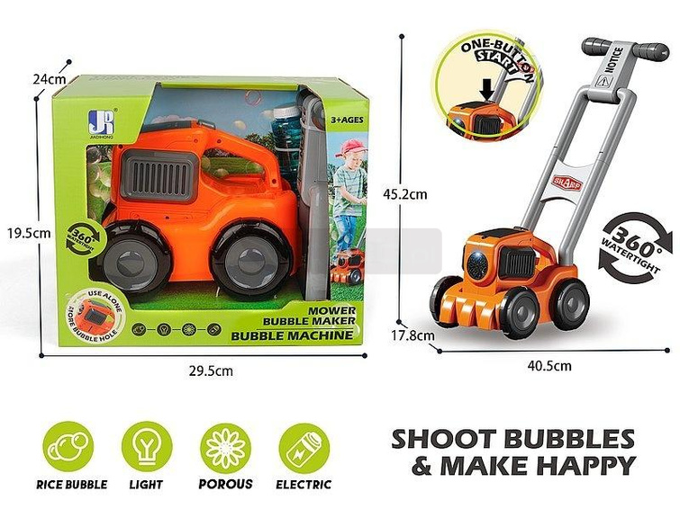 kosiarka z bańkami mydlanymi, na baterie, światło, wodoszczelna, wym.rozłożonej 45x40,5x18cm; 30x24,5x19,5cm, Box