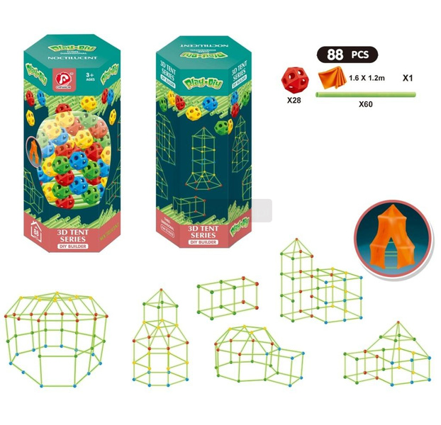 Play-Diy - Świecący w Ciemności Zestaw Konstrukcyjny 3D Namiot - 88 Elementów Zbuduj własny namiot 3D i baw się w ciemności! Przedstawiamy niezwykły zestaw konstrukcyjny Play-Diy, który pozwoli Twojemu dziecku na stworzenie własnego, świecącego w ciemności namiotu 3D! Zestaw zawiera 88 elementów, w tym świecące w ciemności kulki i patyczki, które można łączyć w różnorodne konstrukcje. Zalety produktu: Świecące w ciemności elementy: Kulki i patyczki świecą w ciemności, co dodaje zabawie magicznego charakteru. Kreatywna zabawa: Zestaw rozwija wyobraźnię i kreatywność dziecka, zachęcając do budowania różnorodnych konstrukcji. Rozwija zdolności manualne: Składanie elementów pomaga w rozwijaniu koordynacji wzrokowo-ruchowej i sprawności manualnej. Duży zestaw: 88 elementów zapewnia wiele możliwości budowania. Łatwy montaż: Elementy łatwo się łączą, co umożliwia samodzielną zabawę. Bezpieczne materiały: Zabawka wykonana jest z bezpiecznych dla dzieci materiałów. Idealny na prezent: Doskonały pomysł na prezent dla dzieci powyżej 3 roku życia. Specyfikacja: Marka: Play-Diy Seria: 3D Tent Series Wiek: 3+ Liczba elementów: 88 Funkcja: Świecenie w ciemności Wymiary namiotu: 1.6 m x 1.2 m Zestaw zawiera: Świecące kulki, patyczki, instrukcja Zestaw Play-Diy - Świecący w Ciemności Zestaw Konstrukcyjny 3D Namiot to doskonały sposób na kreatywną i rozwijającą zabawę!