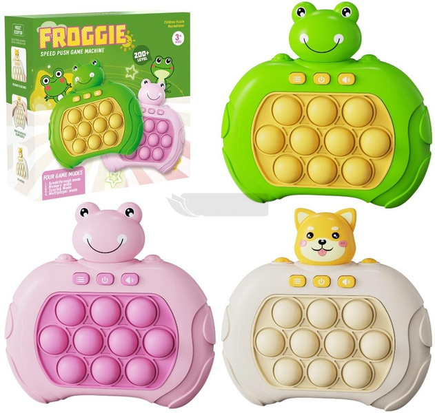 Gra Quick Pop - Żabka, Piesek lub Świnka - Zręcznościowa Zabawa dla Dzieci - 200+ Poziomów Przetestuj swój refleks i szybkość w wesołym świecie zwierzątek! Gra Quick Pop to wciągająca i dynamiczna zabawa dla dzieci powyżej 3 roku życia. Zadaniem gracza jest jak najszybsze wciskanie podświetlonych przycisków, aby zdobyć jak najwięcej punktów. Gra oferuje cztery tryby zabawy i ponad 200 poziomów, co zapewnia długie godziny rozrywki. Zalety produktu: Rozwija refleks i szybkość: Gra wymaga szybkiej reakcji i zręczności. Trzy motywy do wyboru: Dostępne w trzech wariantach: żabka, piesek i świnka. Cztery tryby zabawy: Różnorodność trybów zapewnia urozmaiconą zabawę. Ponad 200 poziomów: Wiele poziomów o różnym stopniu trudności gwarantuje długie godziny rozrywki. Efekty świetlne i dźwiękowe: Gra posiada efekty świetlne i dźwiękowe, które uatrakcyjniają zabawę. Urocze motywy: Zwierzątka dodają grze uroku. Łatwa obsługa: Gra jest łatwa w obsłudze, co pozwala na samodzielną zabawę. Bezpieczne materiały: Zabawka wykonana jest z bezpiecznych dla dzieci materiałów. Idealna na prezent: Doskonały pomysł na prezent dla dzieci w wieku przedszkolnym i wczesnoszkolnym. Wielkość: 13x13x6cm