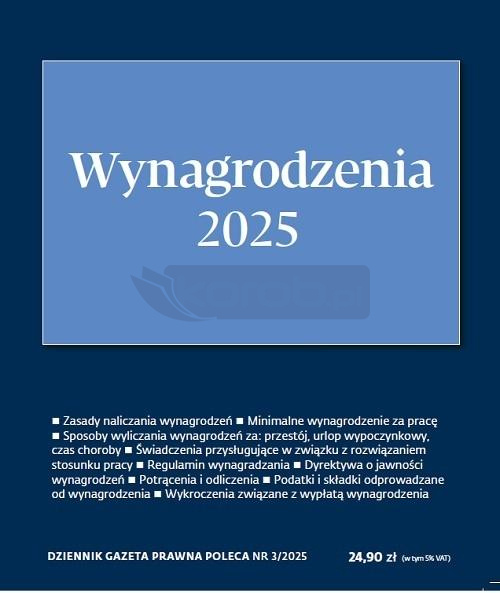 W poradniku "Wynagrodzenia 2025" przedstawione zostały ogólne zasady dotyczące wynagrodzeń, sposób ustalania wynagrodzenia za pracę i innych świadczeń z nią związanych oraz zasady jego wypłaty. Osobnym zagadnieniem, które przybliżamy, jest tzw. dyrektywa o jawności wynagrodzeń oraz regulacje ESG, a także kwestie ochrony wynagrodzenia, należności publicznoprawnych oraz sankcji grożących za naruszenie przepisów ochronnych dotyczących wynagrodzeń. "Wynagrodzenia 2025" - co omawia poradnik? Minimalne wynagrodzenie za pracę Sposoby wyliczania wynagrodzenia, za przestój, za urlop wypoczynkowy, za czas choroby Ekwiwalent za niewykorzystany urlop wypoczynkowy Odprawy dla pracownika Regulamin wynagradzania Dyrektywę o jawności wynagrodzeń Dochodzenie roszczeń Potrącenia i odliczenia ZUS i podatki od wynagrodzeń Wykroczenia związane z wypłatą wynagrodzenia