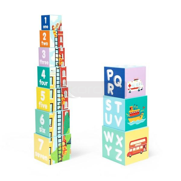 Boppi, piramida edukacyjna Pojazdy to wspaniała zabawa i nauka. Zestaw 10 klocków do układania został zaprojektowany, aby stymulować zmysły dziecka i wspierać rozwój poznawczy. Każdy blok zawiera unikalną kombinację liter, cyfr i zachwycających ilustracji najróżniejszych pojazdów , dzięki czemu nauka jest zabawnym i interaktywnym doświadczeniem. Dzięki tym klockom Twoje dziecko może układać w stosy, sortować i budować, jednocześnie odkrywając alfabet, licząc i oglądać fascynujący świat motoryzacji. Każdy klocek oferuje nową przygodę dla Twojego małego odkrywcy. Układanie i dopasowywanie klocków rozwija zdolności motoryczne, koordynację ruchów u dziecka, ćwiczy pamięć, koncentrację i logiczne myślenie. Produkt wykonany z wytrzymałej tektury pochodzącej z recyklingu.