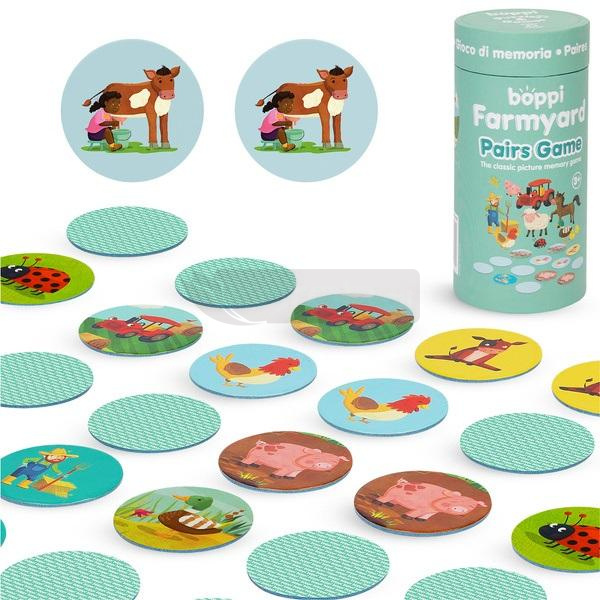 Boppi, układanka w pary memo Farma to wspaniała, edukacyjna gra memo. Super sprawdzi się także w podróży. Gra ćwiczy koncentrację i pamięć oraz logiczne myślenie. Dzieci muszą starać się zapamiętać gdzie były odkładane karty z ilustracjami zwierzątek z farmy, aby potem jak najszybciej znaleźć właściwą parę.