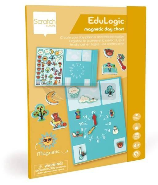 Zadaniem dziecka jest ułożenie planu dnia. Uczy się określać godziny na zegarze, oznaczać pogodę, przyrodę, pory roku oraz dopasowywać odpowiedni do temperatury strój na dwór. Duże i grube magnesy (32 szt) ułatwiają pracę małych dłoni. Gra oprócz zabawy z kolorami i kształtami stymuluje takie umiejętności jak: logiczne myślenie, koncentrację, świadomość przestrzenną i percepcję wzrokową.