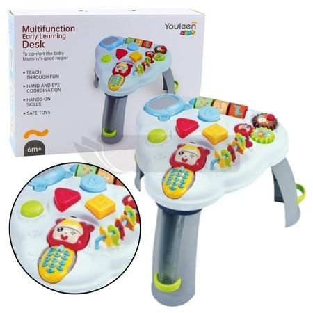 ITERAKTYWNY STOLIK EDUKACYJNY TRÓJKĄTNY Interaktywny stolik edukacyjny dla dzieci to innowacyjna zabawka, która łączy w sobie elementy edukacyjne i sensoryczne, zapewniając rozwój poprzez zabawę. Dzięki różnorodnym funkcjom, dźwiękom i kolorom maluchy mogą poznawać świat w atrakcyjny i interaktywny sposób, jednocześnie rozwijając swoje zdolności manualne, koordynację wzrokowo-ruchową oraz umiejętności logicznego myślenia. Stolik wyposażony jest w interaktywny telefon, który działa po włożeniu baterii. Telefon posiada kolorowe przyciski, które po naciśnięciu aktywują różne dźwięki i melodie, pobudzając ciekawość dziecka i zachęcając do odkrywania nowych bodźców. Na powierzchni stolika znajdują się również przyciski, obracane pokrętła, przesuwane elementy i klocki o różnych kształtach, które uczą dzieci rozpoznawania kolorów i kształtów, rozwijają ich umiejętności sensoryczne i manualne oraz wzmacniają zdolność kojarzenia i logicznego myślenia. Dzięki stabilnej konstrukcji i bezpiecznym materiałom, stolik jest idealnym wyborem dla dzieci już od 6. miesiąca życia. Jego ergonomiczna wysokość pozwala na wygodną zabawę w różnych pozycjach - zarówno siedzącej, jak i stojącej - co sprawia, że rośnie wraz z dzieckiem, dostosowując się do jego potrzeb i poziomu rozwoju. Kolorowa i atrakcyjna forma zabawki sprawia, że stolik edukacyjny to doskonały wybór dla najmłodszych, którzy poprzez interaktywną zabawę uczą się nowych umiejętności, rozwijając swoją wyobraźnię i zdolności motoryczne. SPECYFIKACJA: Wymiary stolika: 50 x 50 x 37 cm Wymiary opakowania: 54,5 x 40 x 13 cm Zasilanie telefonu: 2x 1.5V AAA (brak w zestawie) Materiał: Wysokiej jakości tworzywo sztuczne Funkcje: Interaktywny telefon, kolorowe przyciski, elementy do obracania i wciskania, edukacyjne klocki ZAWARTOŚĆ ZESTAWU: Stolik edukacyjny Interaktywny telefon