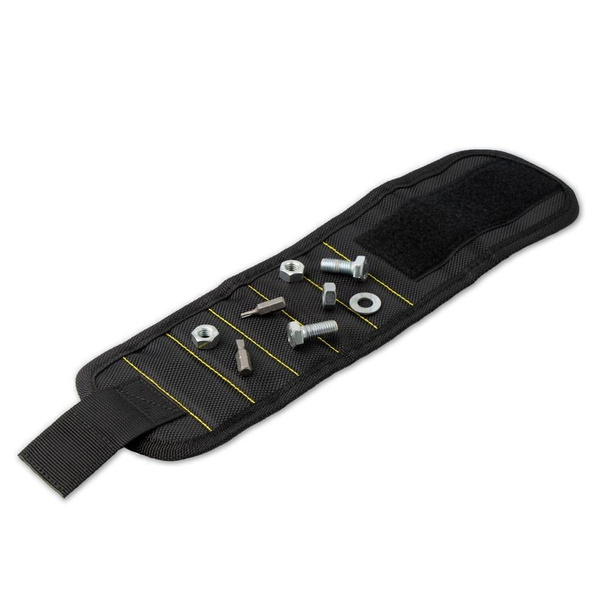 Opaska Złotej Rączki to opaska na rękę z wszytymi magnesami, do której można przyczepić drobne metalowe przedmioty potrzebne podczas majsterkowania lub pracy. Wszelkie śrubki, wkręty, nakrętki, bity, czy nasadki - wszystkie w jednym miejscu i gotowe do użycia.