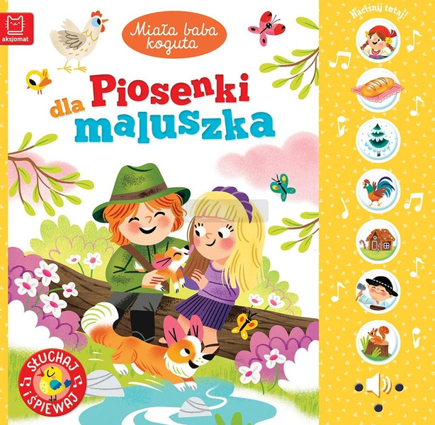Słuchaj i śpiewaj razem z nami! W książce znajduje się siedem lubianych i popularnych piosenek przekazywanych z pokolenia na pokolenie. Kolorowe ilustracje oraz teksty każdej z piosenek zachęcą dziecko do wspólnego śpiewania. Teksty otoczone są kolorowymi ilustracjami, nawiązującymi do treści piosenek, często je uzupełniają, a co najważniejsze - zachęcają do wspólnej zabawy. Piosenkę można włączyć, naciskając kółeczko z obrazkiem po prawej stronie książki. Jedno kółeczko odpowiada jednej piosence. W każdej chwili można wyłączyć grającą melodię, ponownie naciskając kółeczko. Książka działa na baterie, które można wyjąć i wymienić. Istnieje również możliwość wyłączenia grających piosenek, przesuwając guzik przy baterii. Książka sprawdzi się dla dzieci w każdym wieku. Młodsze mogą tylko słuchać piosenek, starsze dzieci mogą przeczytać tekst i śpiewać równocześnie z nagraniem. Siedem lubianych i popularnych piosenek do słuchania i śpiewania: Karolinka Mało nas Biały walczyk Miała baba koguta Malowany wózek Za górami, za lasami Szła dzieweczka. Piosenki, które znają wszyscy, nagrania, które nigdy nie ulecą z pamięci. Książeczki z nagraniami - doskonałe do słuchania i śpiewania!