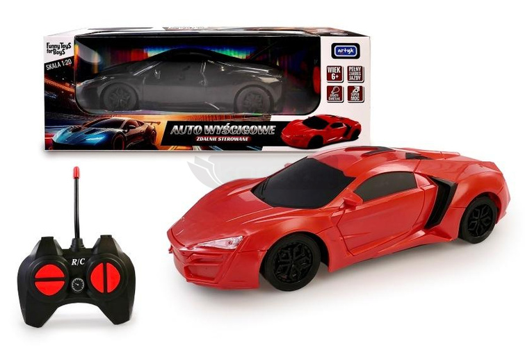 W zestawie: auto 19 cm, kontroler, funkcje: pełny zakres jazdy, działające przednie reflektory, ustawienie zbieżności kół, gumowe opony, skala 1:20, 3 modele do wyboru, wym. opak. 26,5 x 11 x 9,5 cm, baterie 3 x aa (auto), 2 x aa (kontroler) niedołączone, 3+
