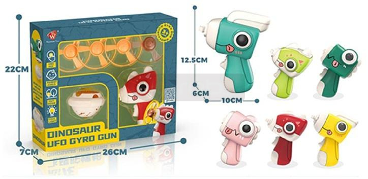 W zestawie: pistolet 12 cm, bączek, 4 śmigła funkcje: po nakręceniu bączka i naciśnięciu przycisku pistoletu bączek zaczyna się kręcić na podłodze, światło w bączku, śmigła po nakręceniu i wystrzeleniu latają, 1 śmigło posiada światło, 6 modeli do wyboru, wym. opak 26 x 22 x 7 cm, baterie niewymienne, 3+