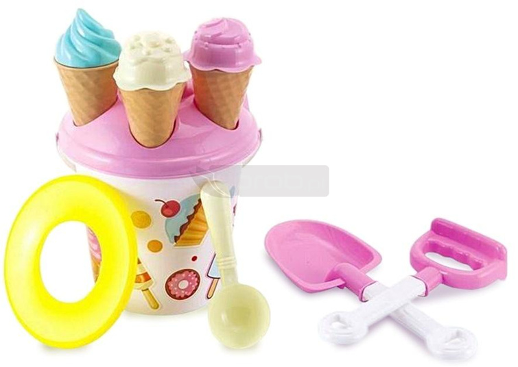 W zestawie: wiaderko do piasku wys. 16 cm, łopatka, grabki, łopatka do lodów, 3 foremki w kształcie lodów, podstawka na lody, pakowane w siatkę, wym. opak. 18 x 18 x 31 cm, 3+