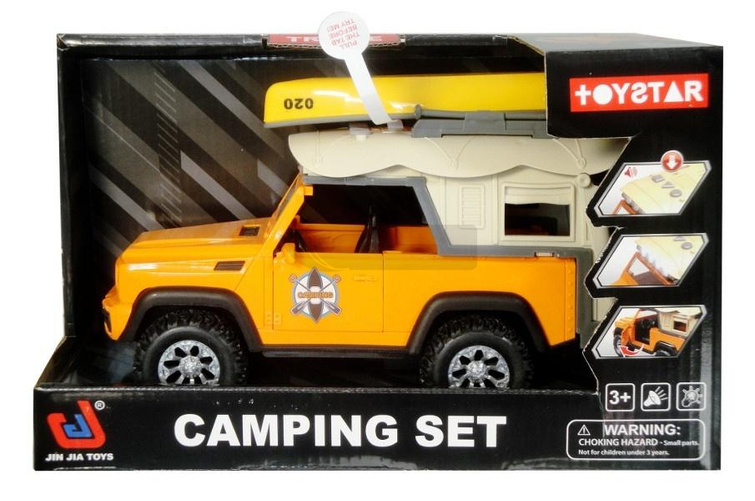 Zabawka auto terenowe sprawdzi się w sam raz do jazdy po trudnym terenie podczas wypadu na camping. Na górze pojazdu znajduje się kajak. Produkt działa na baterie typu AG13. Baterie znajdują się w zabawce. Zabawka zapakowana w kartonowe opakowanie z okienkiem. Produkt dla dzieci od 3 lat. Podane wymiary stanowią wymiar opakowania.