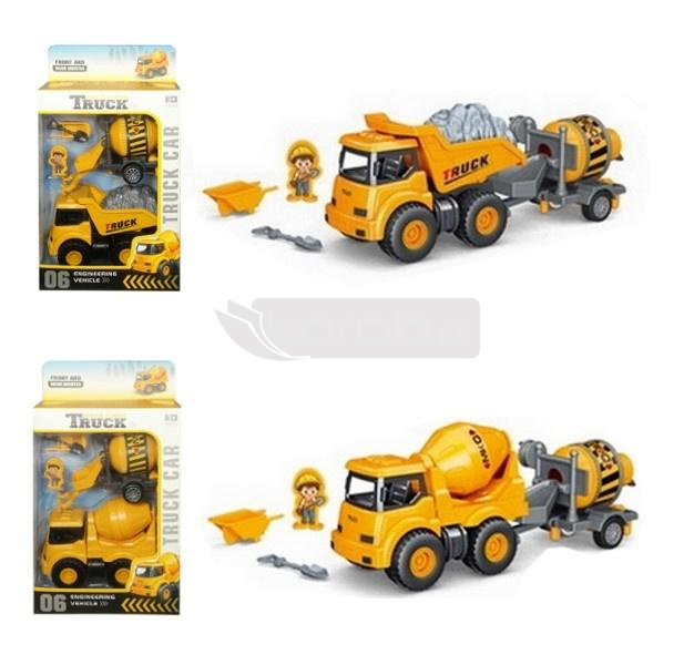 Zestaw budowlany z wywrotką, zbiornikiem mieszającym beton, figurką robotnika, taczką i łopatą. Pojazd posiada ruchome części, ma napęd friction. Produkt będzie uzupełnieniem zabawy w plac budowy. Produkt występuje w kilku wersjach, wybierany losowo. Cena dotyczy jednej sztuki. Zabawka dla dzieci od 3 lat. Podane wymiary są wymiarami opakowania. Produkt zapakowany w kartonowe opakowanie z przezroczystym okienkiem.