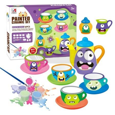 Zestaw składa się z 4 filiżanek, 4 talerzyków, dzbanka, dzbanuszka na śmietankę, cukierniczki, farbek, palete pod farby i pędzla. Mogą malować każdy element zestawu w inny sposób, tworząc niepowtarzalne wzory i kolory.