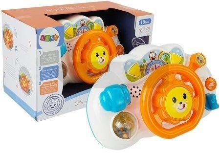 Kierownica Edukacyjna dla Niemowlaka Pomarańczowa Prezentowana zabawka edukacyjna to idealny produkt na pierwsze miesiące życia maluszka. Kierownica wyposażona w kolorowe przyciski sprawi dziecku wielką przyjemność, kiedy dotknięcie wybranego elementu będzie skutkowało pojawieniem się światełek i dźwięków zabawa jest jeszcze lepsza. Dziecko poznaje wtedy otaczający świat, dodatkowo rozwijając jego sprawność motoryczną i zdolności manualne, słuch oraz zdolność rozumienia świata, kształtów i kolorów Zabawka imitująca prawdziwą kierownicę znaną z samochodu rodziców przyniesie dziecku ogromną frajdę i będzie doskonałym rozwiązaniem w trakcie podroży samochodem. Ponadto z prawej strony zabawki znajduje się drążek zmiany biegów, a z lewej regulowane lusterko. Kierownica posiada ruchomy korpus, dzięki czemu można dostosować jej ustawienie do położenia dziecka. Rozmiar kierownicy jest doskonale dopasowany do rozmiaru małych rączek dziecka, co tylko ułatwi mu odkrywanie nowych dźwięków i zjawisk. Funkcje kierownicy: - dźwignia zmiany biegów znajdująca się po lewej stronie posiada 3 biegi i wydaje dźwięk zegara po włączeniu biegu - poniżej znajduje się piłeczka, kiedy dziecko będzie nią poruszać szeleści, a koraliki się poruszają - kręcąc kierownicą słychać stukot - lewy przycisk po prawej stronie załącza muzykę, natomiast drążek posiada trzy etapy, każde naciśnięcie spowoduje przełączenie jednej ścieżki, a lampka zacznie migać z rytmem muzyki - prawy przycisk po prawej stronie, aby odtworzyć 4 rodzaje efektów dźwiękowych w pętli. Każde naciśnięcie przełącza efekt dźwiękowy, a światło będzie migać wraz z efektem dźwiękowym - włączenie kluczyka spowoduje że usłyszymy jak startuje auto, a światło będzie się zmieniać razem z dźwiękiem. Wymiary kierownicy: 22 cm x 10 cm x 16 cm Wymiary opakowania: 27 cm x 15 cm x 17, 5 cm Dziecięca kierownica z deską rozdzielczą przeznaczona jest dla wszystkich maluchów powyżej 18. miesiąca życia, posiada certyfikat CE, gwarantujący bezpieczną zabawę. By dziecko mogło korzystać ze wszystkich funkcji zabawki, należy umieścić w niej dwie sztuki baterii AA 1,5 V, które nie są dołączone do zestawu.