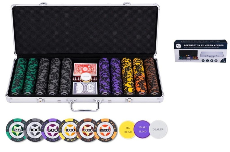 Zestaw do pokera zawiera dwie talie kart, 500 żetonów (z nominałem), trzy znaczniki krupiera, pięć kości i srebrne etui z zaokrąglonymi rogami. - 100 x 25 EUR - 150 x 100 EUR - 100 x 500 EUR - 75 x 1000 EUR - 50 x 5000 EUR - 25 x 25000 EUR.