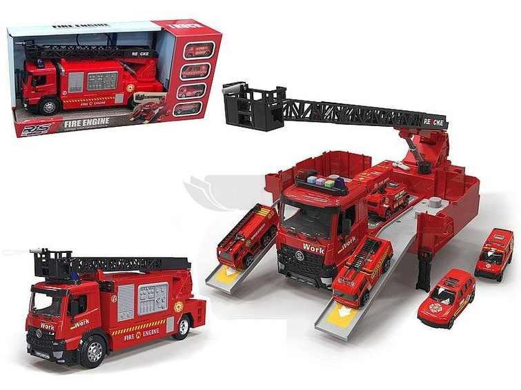 auto straży pożarnej, z rozkładaną naczepą, tworzącą parking, 4 autka, światło, dźwięk, drabina, bat.3xAG13 dołóćzone; 44x11x20cm, W/B