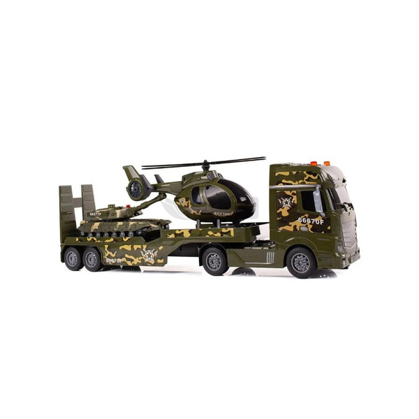 Przygotuj się na pełną emocji akcję w zaciszu swojego salonu! Nasz zestaw Samochód ciężarowy z naczepą, na której umieszczony jest helikopter i czołg wojskowy to zabawka, która wprowadzi Twoje dziecko w świat wojskowych przygód i militariów. Dzięki dokładnemu odwzorowaniu, klasyczna zieleń i czarne elementy z napisami wojskowymi sprawią, że maluch poczuje się jak prawdziwy żołnierz. Zestaw posiada liczne funkcje za
