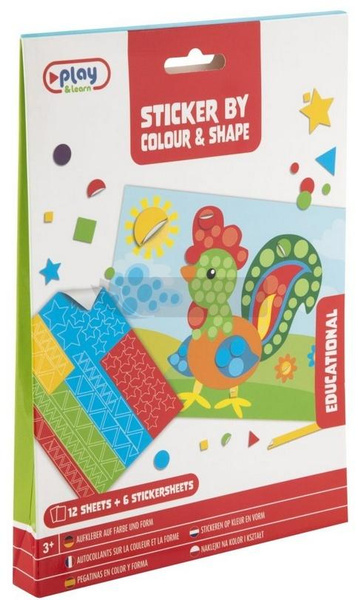 Wypełnianie obrazków po kolorach i kształtach za pomocą naklejek. W zestawie: 12 arkuszy i 6 arkuszy naklejek, wzór: Kogucik. Odpowiednie dla dzieci powyżej 3 lat.