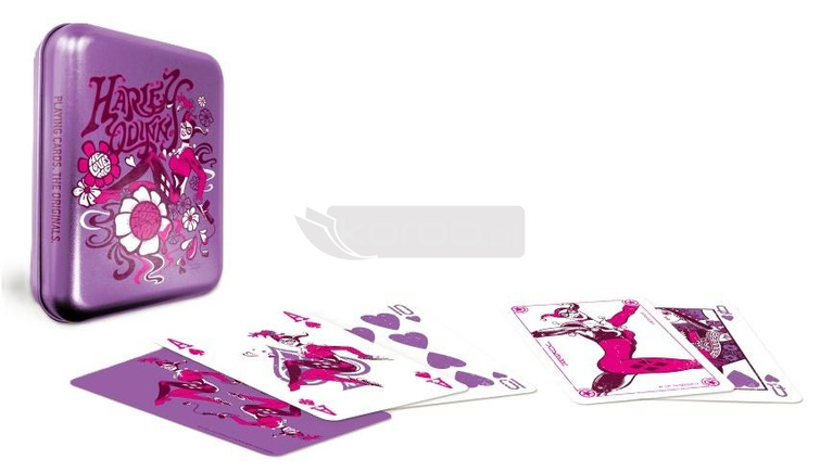 Stylizowana kultową postacią Harley Quinn talia kart do gry. 55 kart pakowanych w personalizowaną metalowa puszkę.