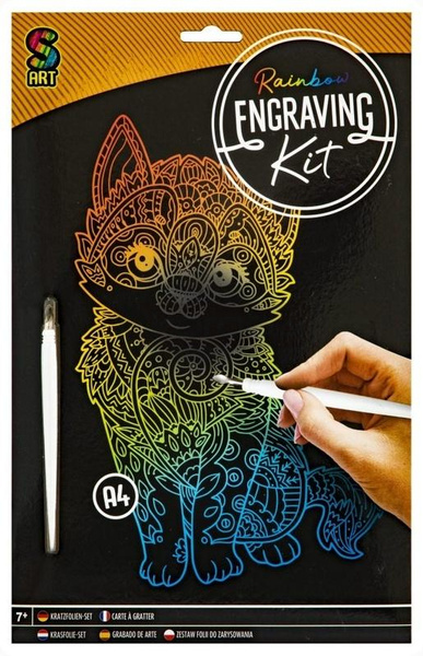 Zestaw do zdrapywania, format A4 Dostępne 4 rodzaje (Tęczowe : Sowa lub kotek oraz Srebrne: Lew lub Piesek )+ rysik do wydrapywania