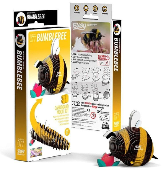 Eugy zaprojektowane w Nowej Zelandii są wykonane z przyjaznego dla środowiska kartonu pochodzącego z recyklingu i farby na bazie ryżu. Zestaw zawiera ponumerowane elementy układanki, nietoksyczny klej oraz instrukcję do zbudowania trzmiela. Zbierz całą serię zwierząt, ptaków, dinozaurów i wiele innych. Dla dzieci w wieku 6 lat+.