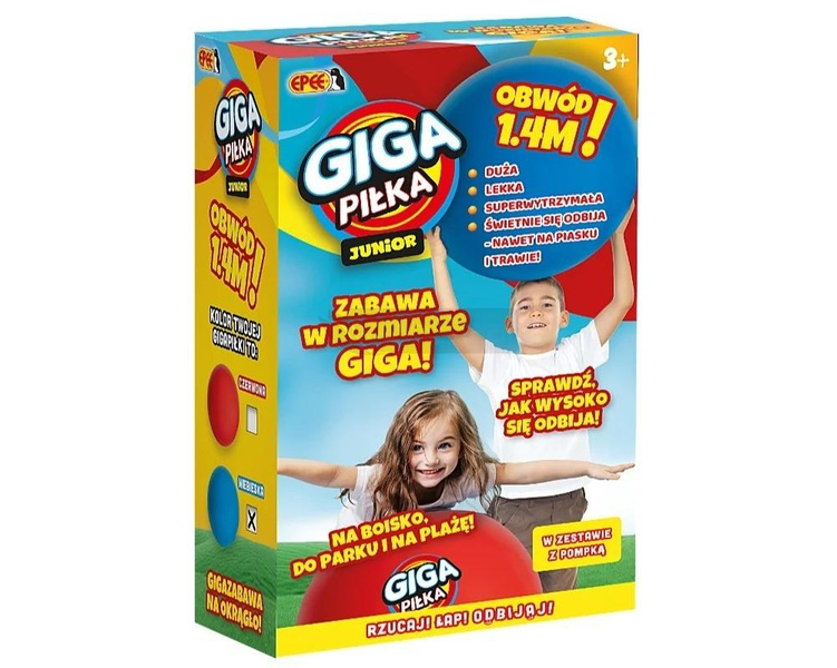 Gigapiłka Junior powstała z myślą o młodszych dzieciach. Jest duża (ma aż 1,4 m w obwodzie), ale lżejsza i bardziej poręczna dla mniejszych rączek. Wykonana z superwytrzymałego tworzywa. Świetnie się odbija, nawet na trudnych powierzchniach, takich jak trawa czy piasek.