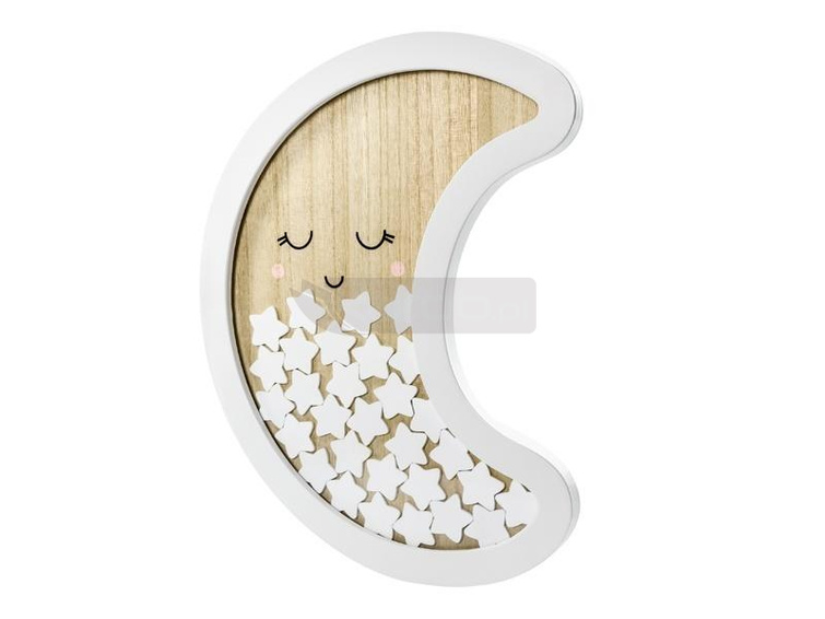 Drewniana księga gości, zestaw zawiera księgę w kształcie księżyca oraz 30 białych gwiazdek do wypisania, wymiary ok. 38,5 x 30 cm.