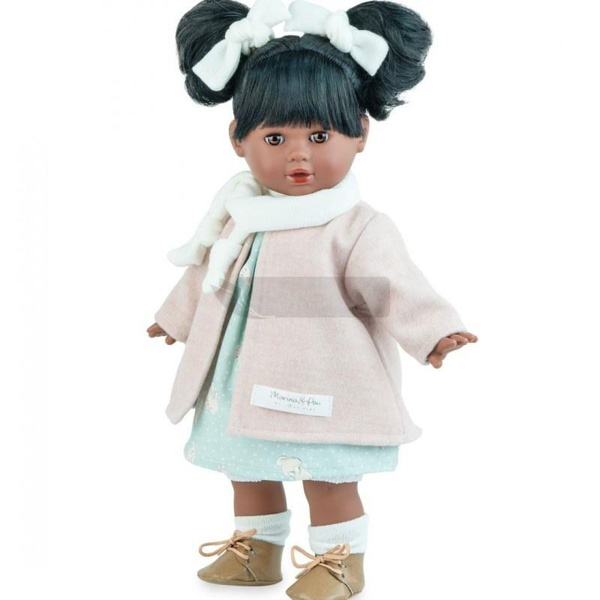Elegancko ubrana, 42-centymetrowa lalka hiszpańska 646 to śliczna dziewczynka z czarnymi włosami związanymi w 2 kucyki, z bestsellerowej serii Tina. To wymarzona zabawka dla dzieci od 3 lat, które uwielbiają lalki przytulać, kołysać do snu, przebierać i czesać. Tina posiada miękki brzuszek oraz głowę i kończyny wykonane z gładkiego, ciemnego, ręcznie malowanego winylu. Podczas zmiany pozycji na leżącą powieki się zamykają. Z kolei obrotowa głowa ułatwia tworzenie nowych fryzur. Poznaj szczegóły wyglądu lalki hiszpańskiej Marina & Pau 646! Idealna do zabawy w odgrywanie roli troskliwej opiekunki, lalka hiszpańska Tina zachwyca gęstymi, miękkimi, lekko kręconymi czarnymi włosami, zebranymi za pomocą białych polarowych wstążeczek oraz ręcznie malowanymi brązowymi oczami, opatrzonymi wianuszkiem rzęs oraz delikatnie zarysowanymi brwiami. Lśniące usteczka oraz rumieńce na policzkach dodają twarzy pogodnego wyrazu. Zwraca uwagę także oryginalnie zaprojektowany, ręcznie szyty luksusowo prezentujący się strój: bawełniana, błękitna sukienka w delikatny, jasny, ciepły elegancki płaszczyk z polarowym szaliczkiem, białe szorty na gumeczce z krótkimi nogawkami, ciepłe skarpetki, brązowe wiązane buciki oraz kokardki zdobiące włosy dopełniają całość stylowego outfitu. Wybierz wysokiej jakości piękną lalkę hiszpańską 646 z kolekcji Marina & Pau! Polecamy zachwycające realistycznym wyglądem i precyzją wykonania lalki hiszpańskie cenionej marki Marina & Pau. Z pewnością sprawią radość dzieciom, gustującym w wyjątkowych zabawkach. Spraw dziewczynce niespodziankę i podaruj jej oryginalną lalkę, zapakowaną w ekskluzywnie prezentujące się firmowe pudełko z logo mniszka lekarskiego!