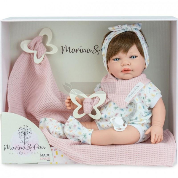 Ślicznie ubrana, 42-centymetrowa lalka hiszpańska 728 to słodki bobas, zaprojektowany dla dzieci od 3 lat, które uwielbiają lalki przytulać, kołysać do snu, przebierać i czesać. Dziewczynka w kolorowym stroju posiada miękki brzuszek oraz głowę i kończyny wykonane z gładkiego, jasnego, ręcznie malowanego winylu. Dzięki przegubowemu ciałku rączki i nóżki są ruchome, a lala siedzi samodzielnie. Poznaj szczegóły wyglądu lalki hiszpańskiej Marina & Pau 728! Idealna do zabawy w odgrywanie roli troskliwej opiekunki, lalka hiszpańska Sweet Baby zachwyca krótkimi brązowymi włosami, zebranymi za pomocą opaski oraz ręcznie malowanymi niebieskimi oczami, opatrzonymi wianuszkiem rzęs oraz delikatnie zarysowanymi brwiami. Lśniące usteczka oraz rumieńce na policzkach dodają twarzy pogodnego wyrazu. Zwraca uwagę także oryginalnie zaprojektowany, ręcznie szyty strój: kolorowe body zapinane na rzep tworzy komplet z miękkimi bucikami i opaską, w zestawie także pudroworóżowy szaliczek oraz kocyk o ciekawej fakturze, udekorowane białym plastikowym motylkiem. Wybierz wysokiej jakości piękną lalkę hiszpańską 728 z kolekcji Marina & Pau! Polecamy zachwycające realistycznym wyglądem i precyzją wykonania lalki hiszpańskie cenionej marki Marina & Pau. Z pewnością sprawią radość dzieciom, gustującym w wyjątkowych zabawkach. Spraw dziewczynce niespodziankę i podaruj jej oryginalną lalkę, zapakowaną w luksusowo prezentujące się firmowe pudełko z logo mniszka lekarskiego!