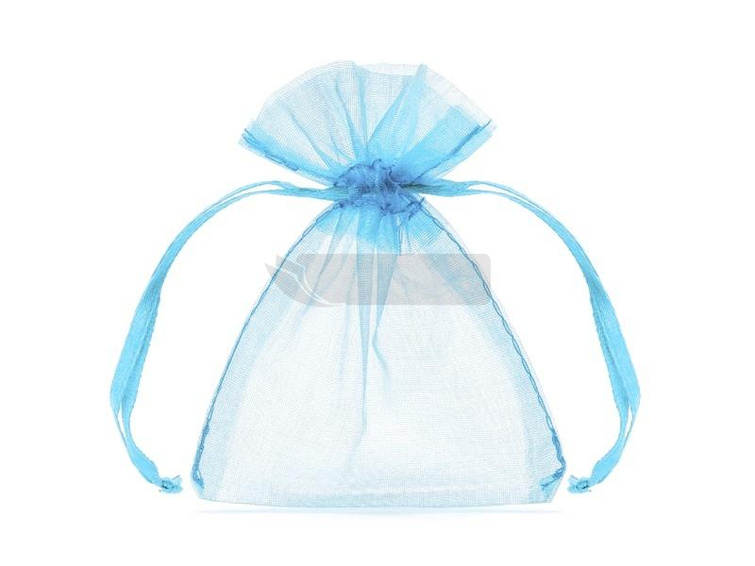 Ściągane woreczki z gładkiej organzy w kolorze błękitnym, wymiary ok. 7.5 x 10 cm. Idealne dla gości weselnych.(1 op. / 10 szt.)