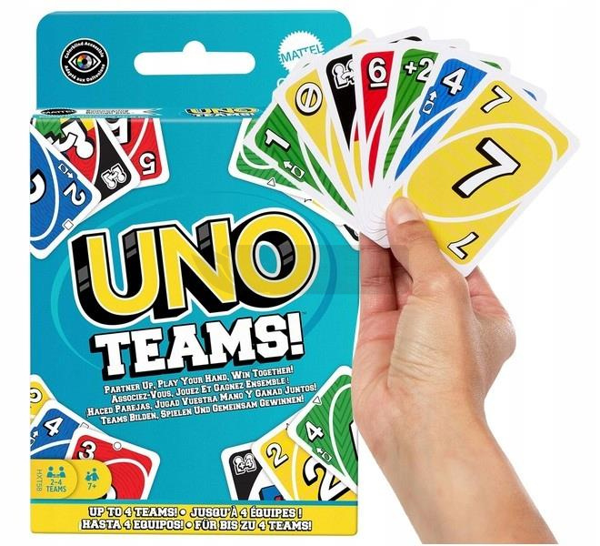 UNO Teams to klasyczna gra, którą znasz i lubisz, ale teraz można w nią grać parami! Karty specjalne, takie jak dzika karta „Zagrywka drużynowa” i dzika karta drużynowa „Wybierz kolor + weź cztery”, pomagają drużynie sięgnąć po wspólną wygraną. Karta z symbolem przekazywania pozwala graczom przekazywać wybraną kartę swojemu partnerowi. Jeśli jedna osoba z drużyny zakończy rozgrywkę, druga bierze połowę jej kart i gra dalej. Każdy gracz musi pamiętać, aby zawołać „UNO!”, gdy jemu lub jego partnerowi w ręku zostanie tylko jedna karta. Ta wesoła rodzinna gra karciana jest idealna dla dzieci od 7 lat, nastolatków i dorosłych.