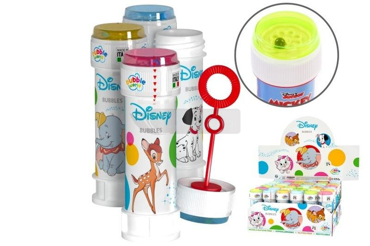 Opis: bańki mydlane z postaciami bajek Disney'a, na każdej nakrętce znajduje się gra - labirynt z piłeczką, ilość płynu w opakowaniu: 60 ml, wym. bańki: 11,5 x 35 cm., 3+