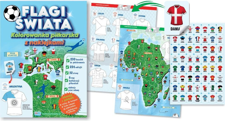 Starannie opracowana publikacja przybliża państwa i terytoria należące do poszczególnych konfederacji piłkarskich. Do pokolorowania jest aż 230 koszulek piłkarskich z flagą danego kraju lub terytorium. Dodatkowym atutem są 224 naklejki, które mogą służyć jako wzór do kolorowania. Mapy zawarte w książce poszerzają wiedzę geograficzną. Obok każdej koszulki znajdują się skrótowe informacje, takie jak nazwa stolicy, kontynent, liczba ludności, powierzchnia oraz przynależność do konfederacji piłkarskiej. To idealny prezent dla miłośników piłki nożnej oraz pasjonatów flag. Edukacja przez zabawę!