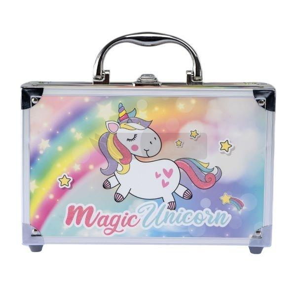 Walizka z motywem jednorożca zawiera bogaty i kolorowy zestaw do makijażu oraz stylizacji paznokci.