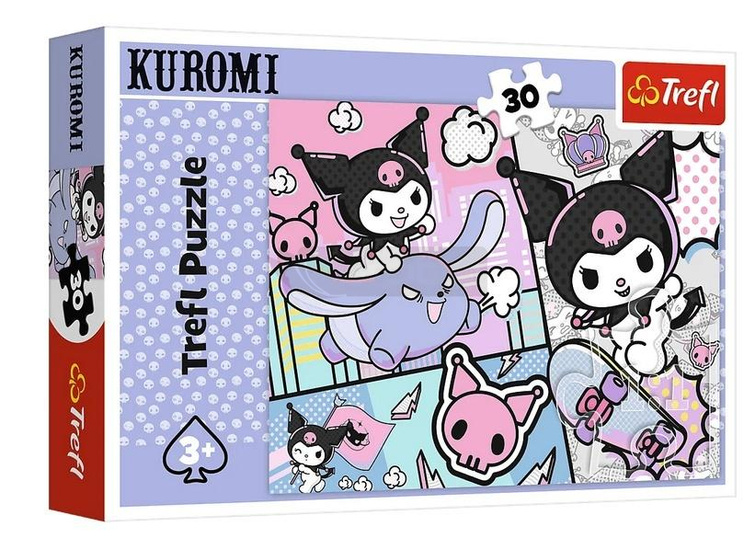 Zabawy z Kuromi to puzzle składające się z 30 elementów, zaprojektowane z myślą o małych fanach Kuromi. Po ułożeniu układanki powstanie obrazek o wymiarach 270x200 mm.