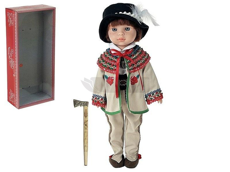 lalka chłopiec 38cm, w góralskim stroju ludowym, z ciupagą dł.16cm, z polskim głosem, śpiewa i mówi po polsku, twarda; Box