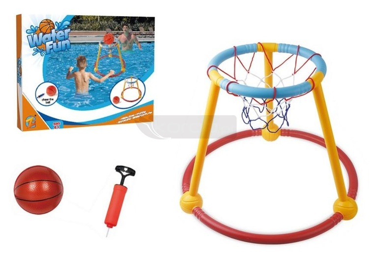 Zestaw do gry w koszykówkę uprzyjemni dzieciom czas spędzony w wodzie. Można z niego korzystać np podczas zabawy w basenie czy nad jeziorem. W zestawie znajduje się: pływający kosz, piłka oraz pompka do piłki. Produkt dla dzieci od 6 lat. Zabawka zapakowana w kartonowe opakowanie. Podane wymiary są wymiarami opakowania: 38x30x7