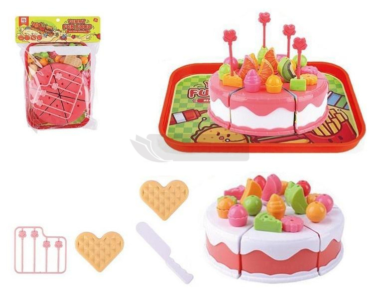 Zabawka tort (na rzepy) do przyozdabiania. W zestawie znajdują się owoce, patyczki z serduszkami i inne ozdoby, dzięki którym tort będzie wyglądał apetycznie. Poza tym w zestawie znajduje się nóż do torta i ciasteczka. Produkt zapakowany w przezroczysty worek. Zabawka dla dzieci od 3 lat. Podane wymiary są wymiarami opakowania.