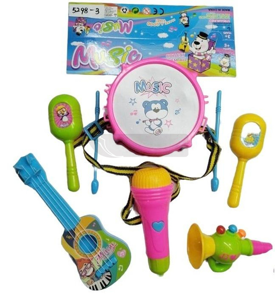 Odkryj wspaniały świat muzyki z naszym kolorowym zestawem instrumentów dla dzieci! Ten fantastyczny komplet zapewni Twojemu maluchowi wiele godzin kreatywnej zabawy, rozwijając jego słuch muzyczny, poczucie rytmu i koordynację ruchową. W skład zestawu wchodzą: Bębenek: Uroczy, różowy bębenek z pałeczkami i paskiem do zawieszenia, idealny do wybijania pierwszych rytmów. Mikrofon: Jasnoróżowy mikrofon z serduszkiem, dzięki któremu Twoja pociecha poczuje się jak prawdziwa gwiazda estrady. Gitara: Mała, niebieska gitara z kolorowymi elementami, zachęcająca do pierwszych prób grania. Trąbka: Zabawna, zielono-żółta trąbka z kolorowymi przyciskami, która wyda radosne dźwięki. Marakasy (2 sztuki): Dwie kolorowe marakasy (zielona i żółta) o przyjemnym brzmieniu, doskonałe do potrząsania i tworzenia własnych melodii. Wykonane z bezpiecznych i trwałych materiałów, instrumenty są idealne dla małych rączek. Żywe kolory i przyjazny design z pewnością przyciągną uwagę każdego dziecka. Zestaw zapakowany jest w kolorowe pudełko, dzięki czemu świetnie sprawdzi się jako prezent na urodziny, Dzień Dziecka lub inną okazję. Rozbudź muzyczną wyobraźnię swojego dziecka już dziś!