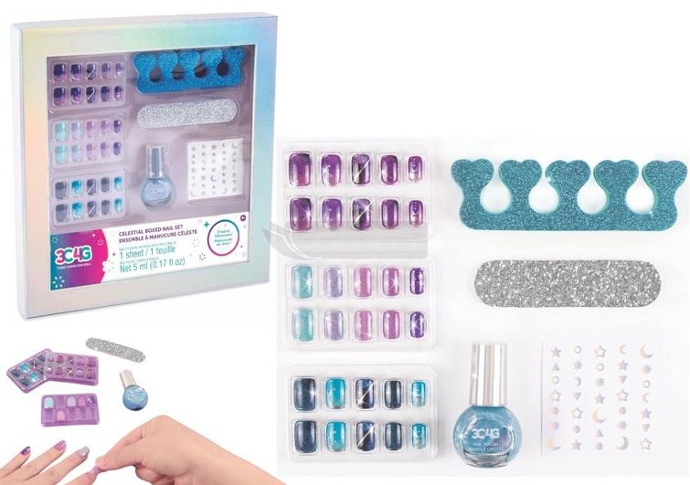 Zestaw zawiera aż 48 sztuk sztucznych paznokci, lakier do paznokci w magicznym, błękitnym kolorze oraz dodatkowe akcesoria, które ułatwią stylizację. Brokatowy pilniczek pomoże nadać odpowiedni kształt paznokciom, a separator do palców sprawi, że ich malowanie stanie się prostsze. Dodatkowe naklejki z gwiazdkami, księżycami i planetami pozwolą na stworzenie niepowtarzalnych zdobień.